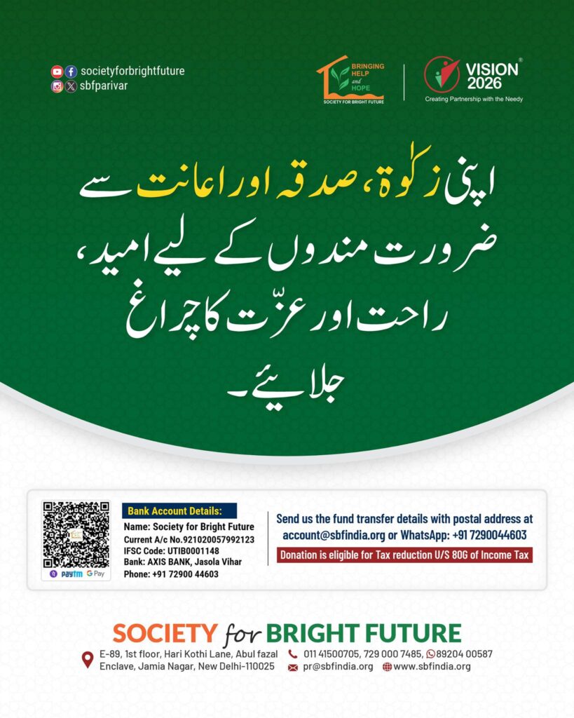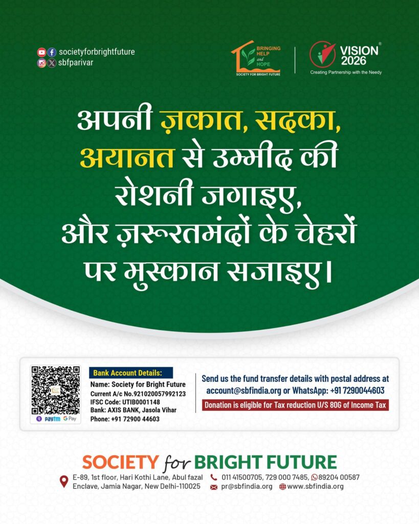 Your contribution can change lives. Support Society for Bright Future by donating your Zakat, Sadaqah, and Ayanat to help underprivileged families with essential relief and humanitarian assistance.